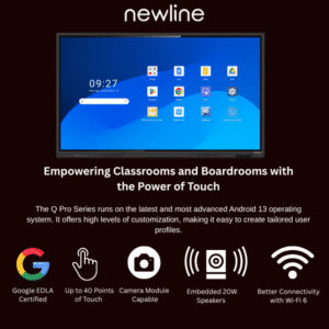 The Newline Q Pro Series redefines collaboration with its advanced 4K UHD display, ultra-responsive IR touch technology, and sleek design. Powered by Android 13 with 8GB RAM, it delivers faster performance, seamless connectivity, and an intuitive user experience — perfect for modern classrooms, offices, and meeting spaces.