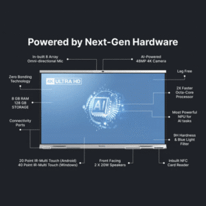 Transform teaching with our Google EDLA Certified AI-Powered Digital Board for Teaching, featuring Android 14, a 2X faster Octa-Core Processor, and the most powerful NPU for AI tasks. Teach seamlessly with an AI teaching assistant, the Connected Classroom App, & an All-in-One Whiteboard. Access all your favourite Play Store apps with enhanced performance & security.